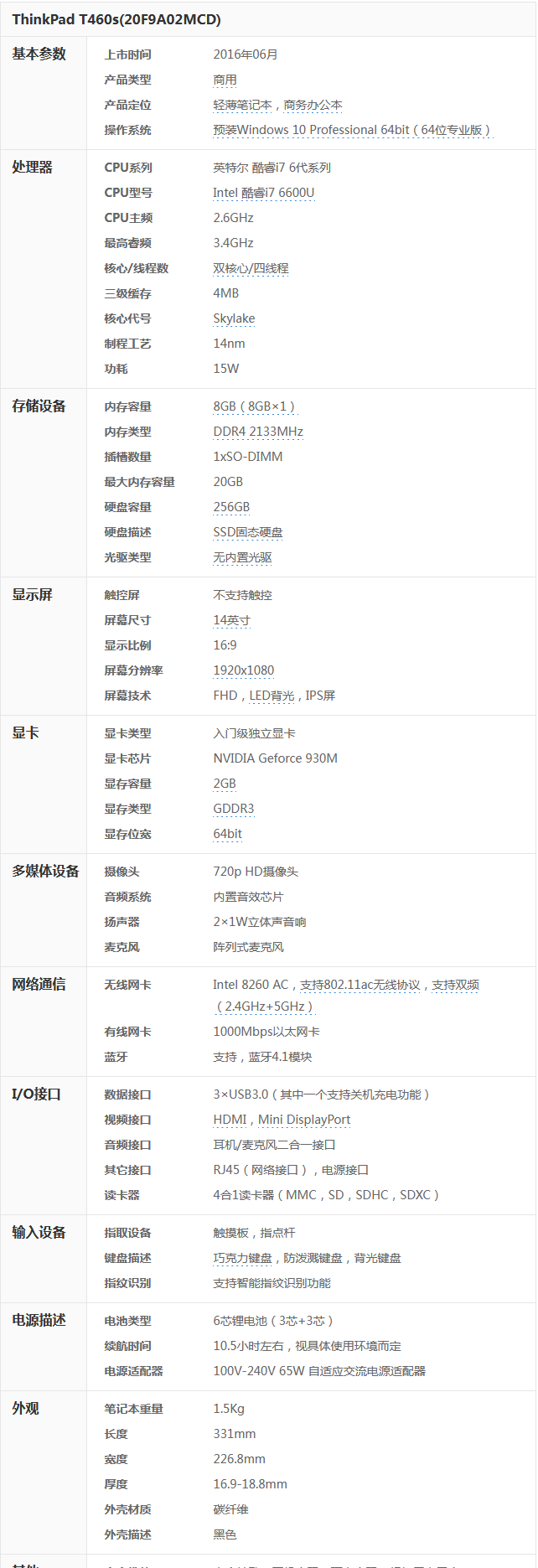 联想THINKPAD T460S商端商务笔记本电脑(I5 6300U/8G/256G/核显/14LED)